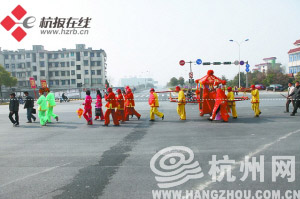 在滨江西兴镇的街道上,一支别有趣味的古装迎亲队伍还是蛮有吸引力的,无论是认识的还是不认识的,无论是开店的还是当营业员的,都跑出来,站在路边看新奇:“谁家抬花轿迎亲啊?”