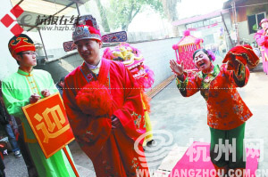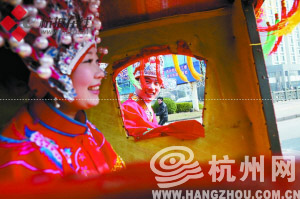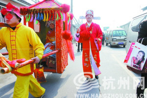 在滨江西兴镇的街道上,一支别有趣味的古装迎亲队伍还是蛮有吸引力的,无论是认识的还是不认识的,无论是开店的还是当营业员的,都跑出来,站在路边看新奇:“谁家抬花轿迎亲啊?”