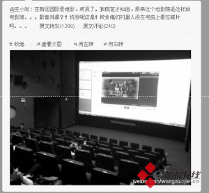@王小街:在新远国际看电影,杯具了。我现在才知道,原来这个电影院是这样放电影滴……暴风影音?!……(为了证实属实,他还附了一张现场照片。)