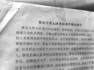 4月30日,小区物业公布了《紫金文苑“4·28”抢劫事件整改报告》,摘录如下: