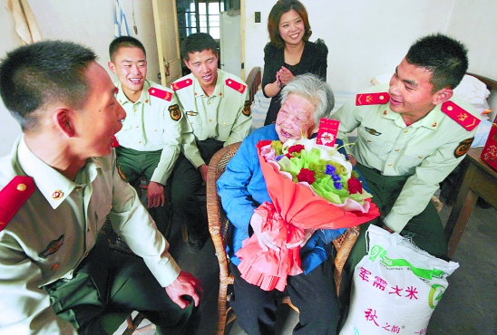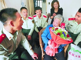 昨日,舟山市武警官兵看望定海区解放街道虎山社区的烈军属王秀兰,向她祝贺母亲节。 通讯员 胡社友 邵建国 摄