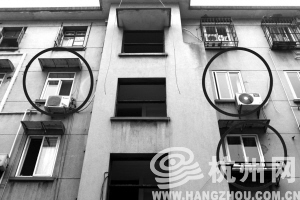 一、二楼的窗户基本都装上了防盗窗,有的还是老式铁条窗。三、四楼装的是推拉窗,左右开的,没有保笼。窗户下不少人家装着空调机。