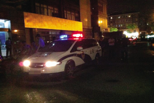 目击者说,晚上8点半多一点,一个四十多岁的女子开一辆银灰色宝马车等在大楼前准备接女儿回家,女儿念高二,在这里补习外语。当时她车门没锁,两个年轻男子突然拉开门,拿刀闯进车里抢劫,女的喊救命,挣扎中手受了伤,一个包被抢走了。两个男的下车后往北面跑了。