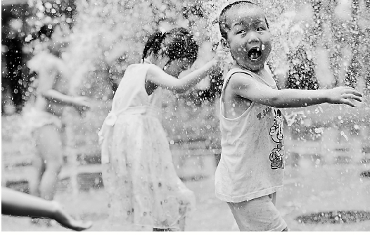 7月8日上午,在杭州青少年宫喷泉旁,一群放暑假的孩子们在戏水、嬉戏,好不开心,享受着水中的清凉。