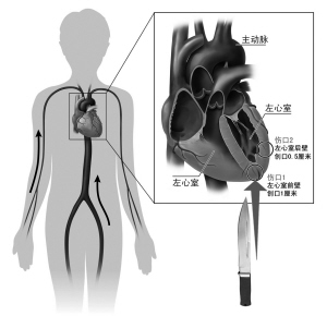“快!”,麻醉医师麻醉,手术医师消毒、切开皮肤。5分钟后,胸腔打开。医生看到,随着心脏的跳动,血不断地从两个洞里喷射出来。一个在心脏的左心室前壁,创口有1厘米,一个在左心室后壁,创口有0.5厘米。
