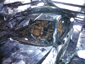 起火的1-2号烤漆房前横七竖八堆了几块扭曲的铁皮,全有烧过的痕迹。整个烤漆房面积二三十平方米,分隔成两部分,左侧摆着些桌椅、工具跟烤漆桶,右侧看起来是个工作台,上面停着一辆黑色索纳塔,表面被烧焦,车内也被烧得乱七八糟,车尾被一张大铁皮压住。
