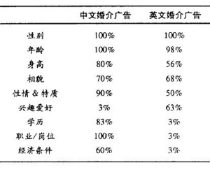 以下是一项针对六十篇中美征婚广告进行的研究中所得出的数据:
