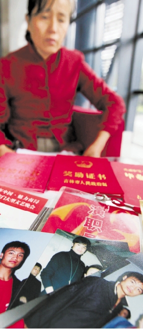 薛晓明的母亲来到本报,拿出儿子的照片和演出证书,止不住地悲伤。记者 林云龙 摄