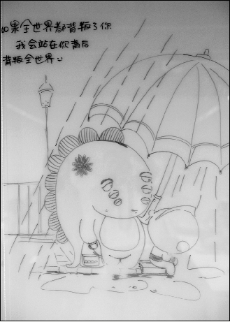 有人说,写字楼就像钢筋水泥的树干,缺乏生长的能力,没有生命的色彩。而最近,杭州支付宝公司新大楼从4楼到22楼的办公室里多了一道不一样的风景——玻璃墙上出现了各种各样的“涂鸦”:黑色的签字笔画出了奥特曼打小怪兽的全过程;拿着棒棒糖开心大笑的大头娃娃;舞蹈的迈克·杰克逊;最简单的广播体操示意图……