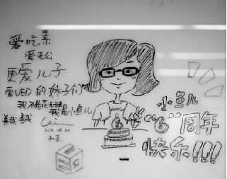 涂鸦,还能作为礼物。“小鱼儿”进支付宝6年的礼物就是一幅涂鸦,画面上,一个漂亮MM手捧庆祝蛋糕,旁边写着同事对她的认识:爱吃素、爱老公、更爱儿子,爱UED(记者注:部门名称)的妹子们,我不是花无缺,我是小鱼儿。这个礼物经济实用、合影效果强、保留时间长,堪称礼物中的极品。