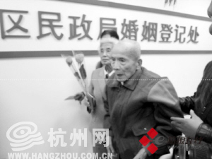 “领证,不是为了告诉你我有多爱你,只是,想谢谢你,一辈子陪着慢慢变老(2011年11月11日‘光棍节’,杭州,男方92岁,女方88岁,重新领取‘结婚证’,他们在女方19岁时,以传统方式‘结婚’,从未领取‘结婚证’,一直相伴至今)。”昨天,这条微博在网上被转发100多次,感动了很多人。92岁的爷爷叫陈长根,88岁的奶奶叫姚金凤。