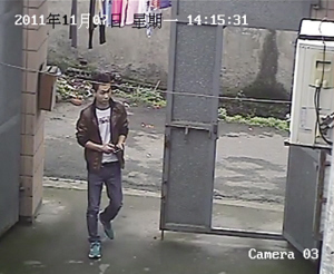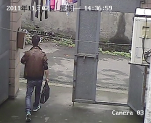 2011年11月7日下午2点15分,这名男子手里拿着疑似手机的物品走进农居房大门。下午2点37分左右,他走出农居房,手里拎着电脑包。事主说,这只电脑包就是失窃的那一只。