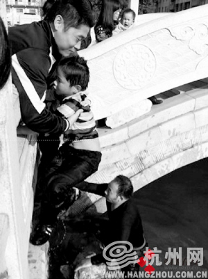 昨天下午2:22,据西湖之声微博:好突然,一位小男孩扑通一声落水,一位路过的中年男子眼疾手快,马上脱了皮衣就跳下水塘救人。