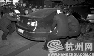 交警、协警和路人合力把被撞的大众车推到路面上 记者 朱丹阳 摄