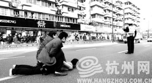 见习记者舒俊核实报道:昨天下午2点半,张女士开车去马市街。路过庆春路红菱公交站(庆春路秋涛路口以西约150米处)时,看到靠近中央隔离带的车道上,一个男的被另外两个男子摁牢在地。