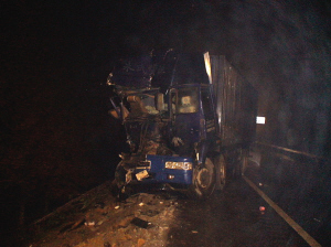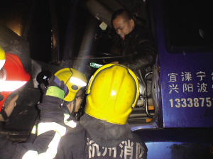消防赶到时,发现靠右的车道上一辆江苏牌照的蓝色大货车已将护栏撞断,车身凌空,车头被撞得稀烂。车内有两人,一名乘员没有受伤,驾驶员右腿被方向盘卡牢,动弹不得。