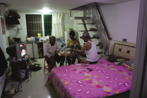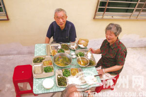 住在椰岛公寓的老人们集体吃午饭(下图)
