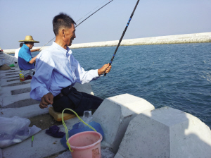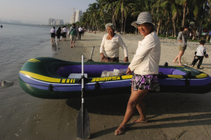 晨练一般持续到将近9点,人渐渐少了下去——很多人要回去买菜做饭。留下的人,打牌下棋,钓鱼游泳,放风筝,玩轮滑……正午时海边阳光强烈,人数最少,带了午饭的老人,就在椰树下铺块垫子,吃饱喝足倒身就睡。也有人带了吊床,挂在椰树上摇来晃去。