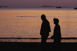 黄昏,吃过晚饭的老人们再次向海边聚集。此时夕阳西下,晚霞满天,海风习习。没有吹拉弹唱,没有欢声笑语,人们或坐或走,看着晚霞落日,悠闲地散步聊天。这是海滩上一天中最温柔静谧的时刻。
