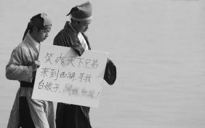 两人身穿古装,脚穿布靴,衣服一白一绿。其中一人手上还拿着一块泡沫板,上面写着:“笑爽兄弟天下行,来到西湖寻找白娘子……”