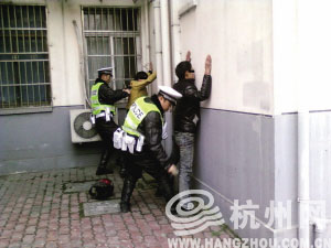 12:51,钟先生发来现场照片并附言:事情发生在今天上午8点左右,环城西路,省人民大会堂对面,我目睹两个人民警察勇擒嫌犯,场面非常勇敢!现将我手机在现场拍摄的两张照片发给贵报社。我发照片的用意是为了表示感谢为杭州市人民的安全站在一线的警察同志而不在于稿费。感谢贵报社的重视与平台! 市民 钟XX