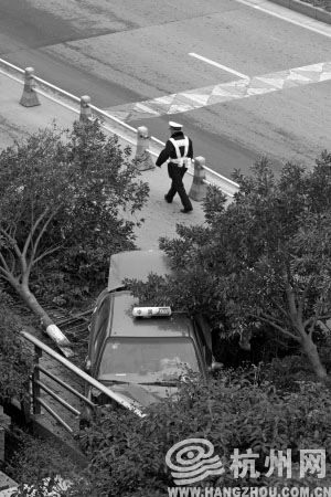 出租车超车后失控冲上人行道。记者 胡聪 摄