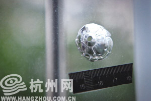 弹珠打穿的窗户玻璃 记者 陈中秋 摄