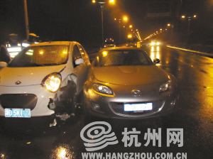 昨天凌晨2:48,读者朱鑫华报料:天目山路东往西方向,古墩路不到一点,一辆马自达跑车和一辆熊猫轿车相撞,撞得还挺厉害。马自达跑车车主是一个黑人老外,听说是加纳人,普通话说得很好,好像喝了酒。熊猫车是个女司机,也喝酒了,跑了。