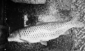 伴随着噼里哗啦一阵水花,这条鱼终于出现在人们眼前。金黄的鱼鳍,圆鼓鼓的鱼肚子,鱼唇上还有两根短短的胡须。四周马上一片惊叹声:“好大一条鲤鱼!”