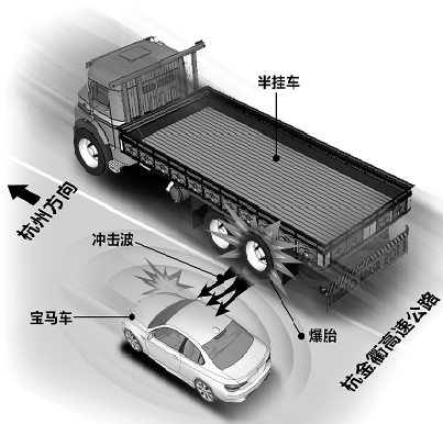 高速交警告诉记者,事发后,他们通过调看监控、做笔录以及请上海权威鉴定机构鉴定,才认定华晨宝马的车损跟半挂车爆胎有直接关系。在由上海鉴定机构出具的鉴定意见中,有如下表述:因受到外界强烈气浪冲击后瞬时消失,使华晨宝马右侧碰撞传感器产生了一个急减速度,造成电流导通,传递到安全传感器后,又被安全传感器认同,从而触发右侧气帘和侧气囊的引爆展开。