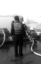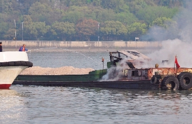 接到报警后,海事部门紧急启动3艘海事艇赶赴现场,并立即联系了消防部门。“船老大说,船上还有2吨柴油和2个煤气瓶,一旦被引燃,随时有爆炸的危险。”海事船检室林主任告诉记者,更关键的是,这艘船仍继续向钱塘江大桥靠拢。所以,在出动的3艘海事艇中,其中有一艘是大马力的拖轮,用来固定起火运沙船,让它别再“乱跑”。