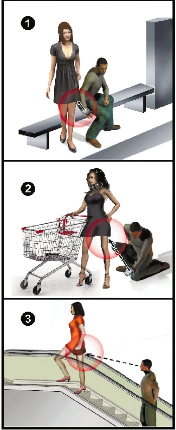 本报也曾经报道过类似的事件,有不法分子在大超市里找寻目标,遇到穿裙子的女性,假意在她身边摔倒或系鞋带,实则用手中的拍摄器,或相机或手机拍摄。更有甚者,会在身体的某个部位(比如鞋子面上)装上一个小镜子,以满足自己的变态心理。