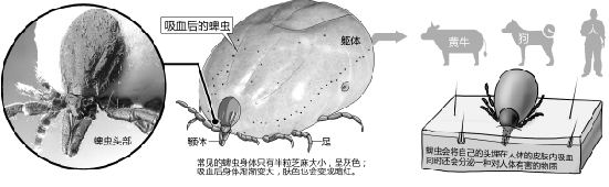 蜱虫身上携带的病原容易引起疾病。除了毒性,蜱虫自身也会对人体产生危害。“它会将自己的头埋在人体的皮肤内吸血,同时还会分泌一种对人体有害的物质。若不及时取出,轻者引发皮肤疾病,重者甚至危及生命。”杭州市中医院皮肤科主任陶承军说。