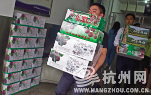 汽车南站出口旁边,就是杭州长运站场快运分公司南站营业部。昨天午后,铁门前一对中年夫妇在和货的司机谈价格,身后摆着二三十箱包装崭新的绿色纸箱,上面写着“仙居杨梅”的字样。