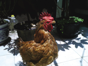 今天我看那个鸡整个鸡头已经是公鸡了,下半身还是母鸡,天气太热了,我看着它也烦躁,要早点杀掉了,我就想知道这个鸡到底能不能吃,如果可以,我现在就要杀掉了,反正没地方关了,它脖颈上的毛已经被我拔掉一些了。