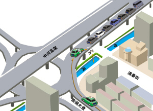 我从西湖大道匝道开上了中河高架涌金转盘。
