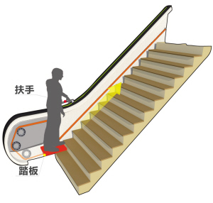 仔细观察了一下,这些电梯上下两头的底部,都有一块可以开合的铁板。摁下一个红色按键,铁板就会打开。这时,一块踏板就伸了出来。