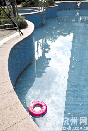 昨天上午,山水人家小区的室外游泳池,入口处已经围起不锈钢栏杆,栏杆上贴了一张告示:游泳池在营业过程中出现问题,现暂停营业。落款单位是“浙大求实物业”,时间是7月31日。