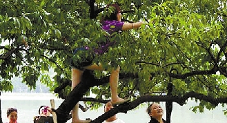 昨天,微博上有个“摘桃姐”红了,她的“走红”源于被人拍到在游人如织的白堤上,她“姿态万千”地攀上桃树,摘取颗颗小青桃。照片有一组,有位一开始在下头观望的大姐在后来几张图片里也显然HOLD不住了,也开始用阳伞勾着桃枝蠢蠢欲动。
