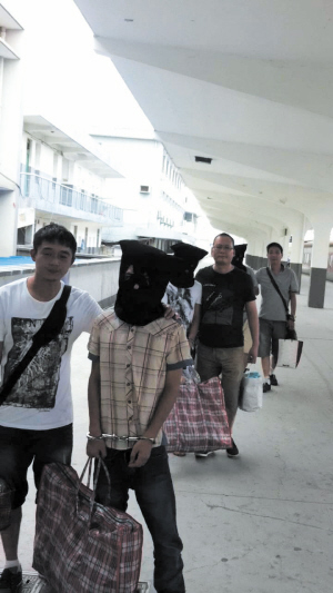 三犯罪嫌疑人戴着头套被警察押解回杭
