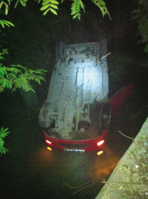 “晚上10点左右,我骑着摩托车上班。当时,跟在我后面有两辆车,一辆是红色奇瑞,一辆是黑色小轿车。开到一个弯道时,我眼前突然飘起一层灰,奇瑞超过了我,再一看,奇瑞翻到路下面的河里去了,我停下摩托车,把摩托车灯对准河里,河沟大概2米多深,那辆车车头栽在水里,轮子还在转,双跳灯亮着。