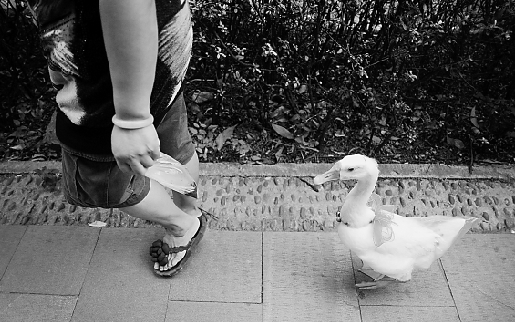 “阿姨每天早晨和傍晚都会出来,身后就跟着一只大白鹅,屁股一扭一扭地跟着她一起散步,很可爱咧。”