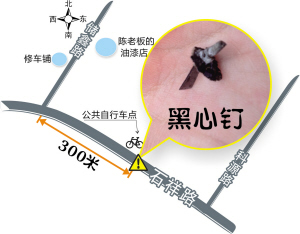 “有辆电动车前轮刚被黑心钉扎破,我还没来得及补。”陈老板说,“我在这里开店有三四年了,我要到处送货的,我自己感觉,这几个月,我们石祥路储鑫路这一带的‘黑心钉’最猖狂了。一个月内胎被扎破两三次,算我运气好,运气差起来,一天6次我都碰到过。”