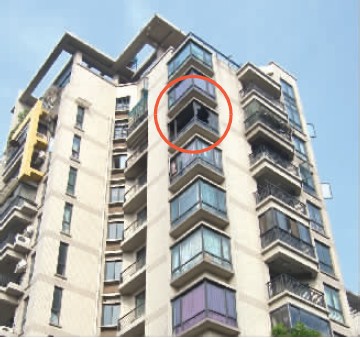 圆圈处为着火的9楼 记者 张平 摄