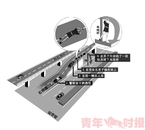 昨日00:52,周先生来电:机场路秋涛路口高架,有人醉酒驾驶,遇到交警检查,他弃车逃跑,从高架上面跳下……