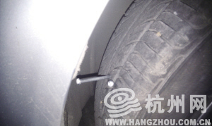 “我开车10多年了,凭直觉,在轮胎下放钉子,是不可能扎到轮胎里去的,钉子应该是事先被人恶意用榔头敲进去的。”吴女士说。
