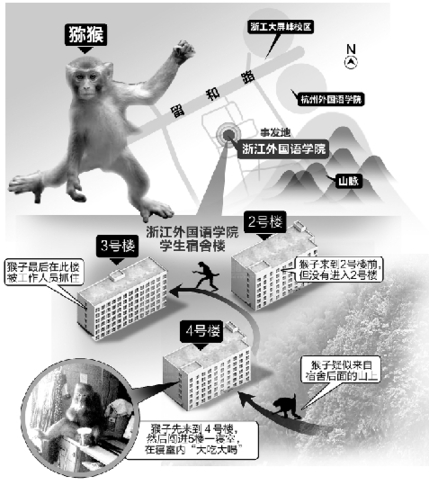 这幢楼的女生说,猴子还去光顾过这幢楼的其它寝室,有的待了待就走了,有的吃了点东西就走了,在5楼这间寝室待的时间算是比较长的。