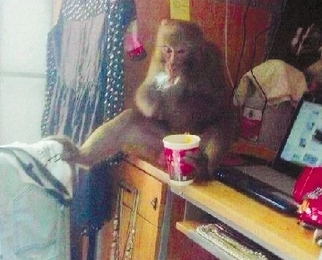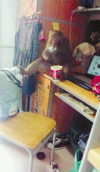 猴子的每一次蹿上蹿下,总能引来女孩们的尖叫。玩久了,它干脆在靠近阳台的电脑桌上坐下来,东张西望,一会弯腰拿拿地上的包,一会把桌上的塑料袋扔到地上,好像正在找东西。