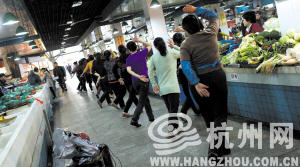 昨天下午2点,朝晖六区菜场里人不多,木凳上红色播放机放着抒情的《浪漫的草原》,四五米宽的过道上,13个大姐排成一队,摆手、摇晃、转身……