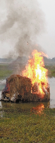 昨天的北湖,天空阴沉,时有小雨。由于北湖是苕溪的泄洪区,四周的公路已经不通,我们只能从大坝外步行进入北湖。北湖是草甸地带,小水塘众多,草地坑洼泥泞难行,行走必须换上高筒雨鞋。步行不到半小时,我们就在一个小水塘发现了野鸭网,网中没有媒鸭(用来引诱野鸭飞落的家鸭),森林警察上前拉网就地销毁。